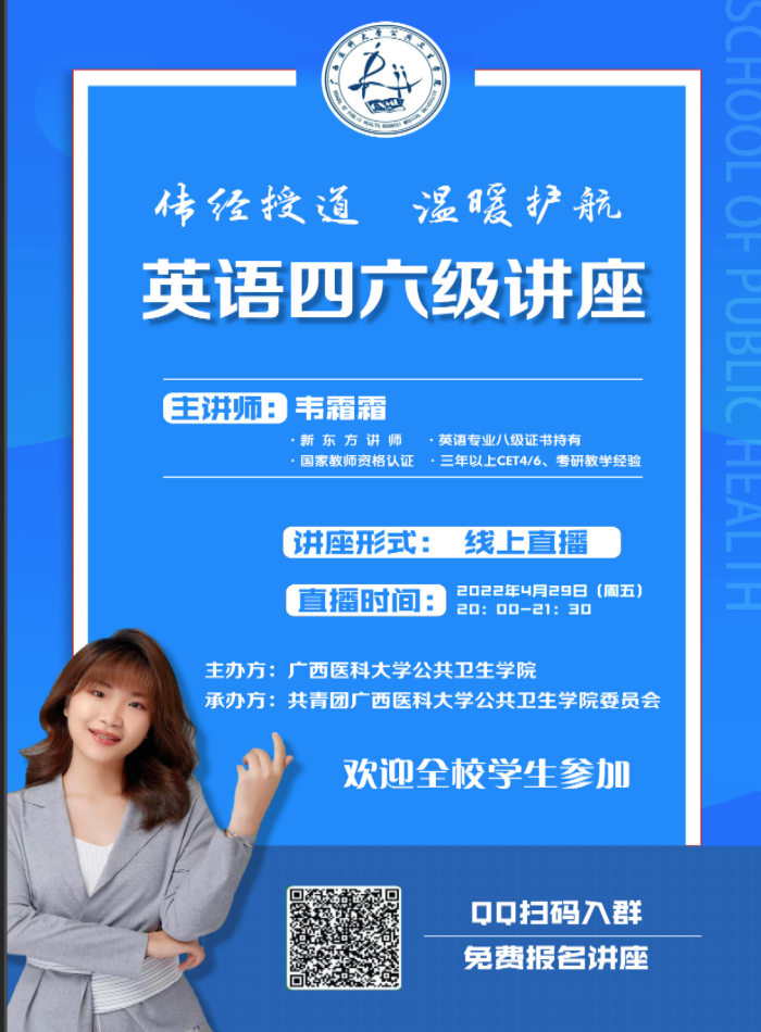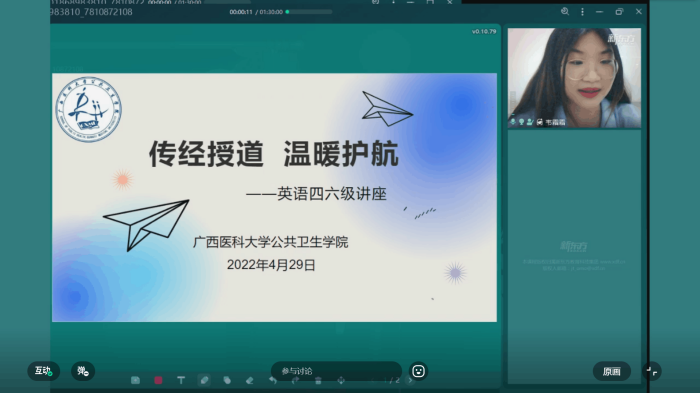 当前位置:学生工作为提升大学生英语四六级通过率,帮助报考同学更科学有效地备考。2022年4月29日晚,澳门六合彩 通过线上直播的方式举办 “传经授道,温暖护航”英语四六级讲座,面向全校学生。澳门六合彩 特邀新东方韦霜霜老师担任本次讲座的主讲人,全校接近200名学生参加了本次讲座。