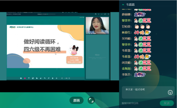 当前位置:学生工作为提升大学生英语四六级通过率,帮助报考同学更科学有效地备考。2022年4月29日晚,澳门六合彩 通过线上直播的方式举办 “传经授道,温暖护航”英语四六级讲座,面向全校学生。澳门六合彩 特邀新东方韦霜霜老师担任本次讲座的主讲人,全校接近200名学生参加了本次讲座。