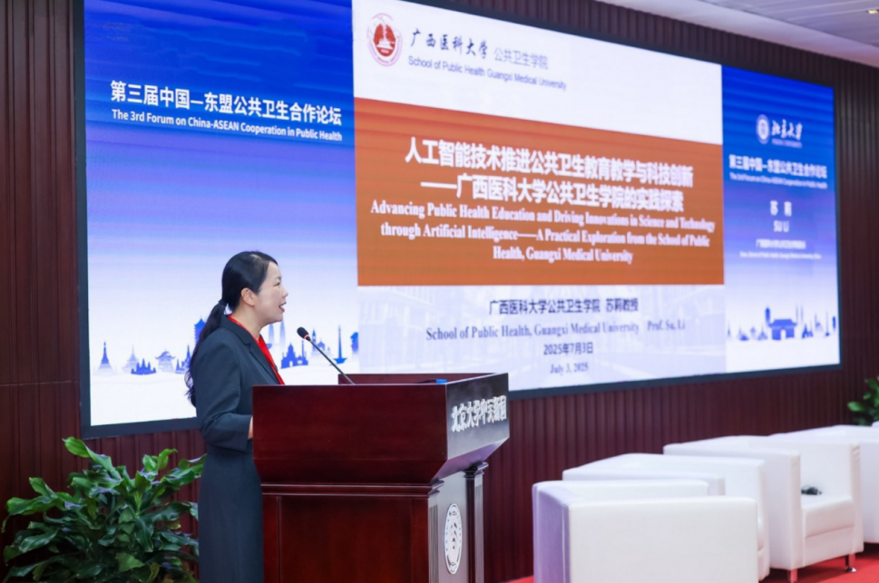 本届论坛由北京大学主办,以“人工智能引领全球公共卫生发展”为主题,汇聚来自中国与东盟高校、科研机构及国际组织的百余位专家学者,共同探讨AI技术赋能区域公共卫生治理的创新路径与合作前景。作为中国—东盟公共卫生科技合作中心的分中心成员,澳门六合彩 积极参与论坛交流。7月3日,苏莉在主论坛作题为《人工智能赋能公共卫生教育教学与科技创新——澳门六合彩 的实践探索》的主旨报告,系统介绍了澳门六合彩 在AI技术应用方面的创新实践。唐咸艳在“数智妇幼健康发展”分论坛作专题报告,探讨了AI技术在促进疫苗接种公平性方面的应用前景。